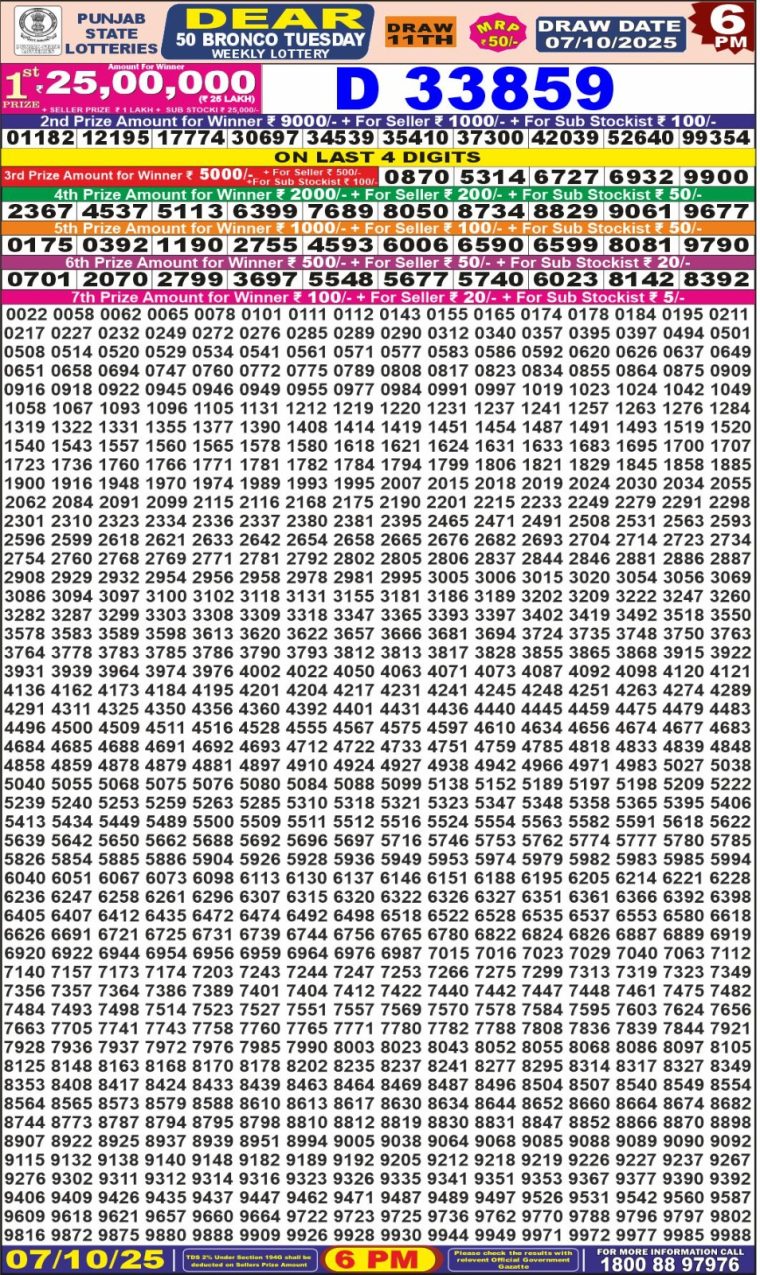 The much-awaited Punjab State Dear 50 Bronco Tuesday Weekly Lottery Result 6pm 07-10-2025 Declared for the Day. This exciting lottery scheme, run by the Punjab State Lotteries Department, offers a massive 1st prize of ₹25 Lakhs with tickets priced at just ₹50.