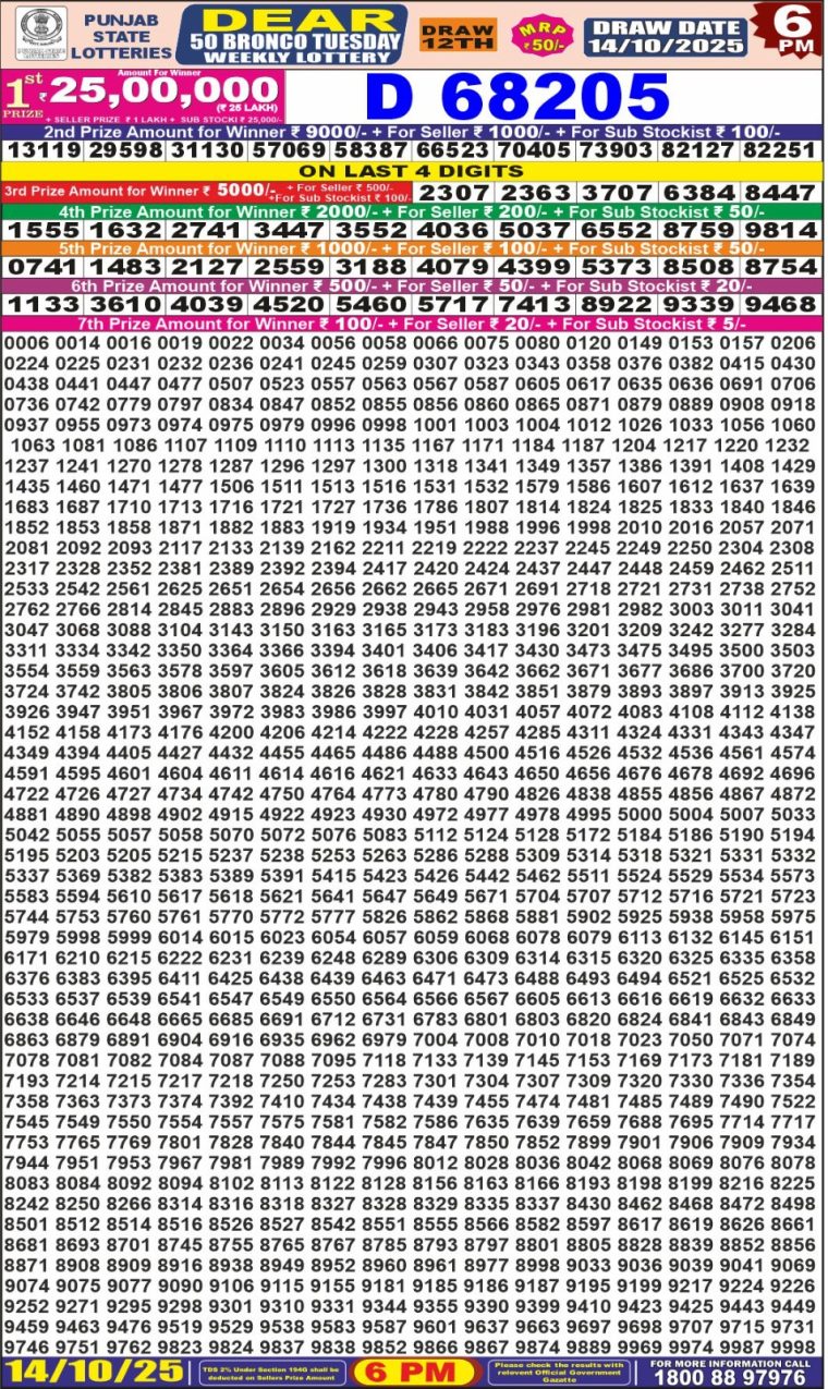 The much-awaited Punjab State Dear 50 Bronco Tuesday Weekly Lottery Result 6pm 14-10-2025 Declared for the Day. This exciting lottery scheme, run by the Punjab State Lotteries Department, offers a massive 1st prize of ₹25 Lakhs with tickets priced at just ₹50.