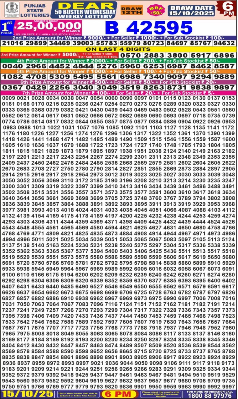 The much-awaited Punjab State Dear 50 Buster Wednesday Weekly Lottery result 6pm 15-10-2025 Declared for the Day. This exciting lottery scheme, run by the Punjab State Lotteries Department, offers a massive 1st prize of ₹25 Lakhs with tickets priced at just ₹50.