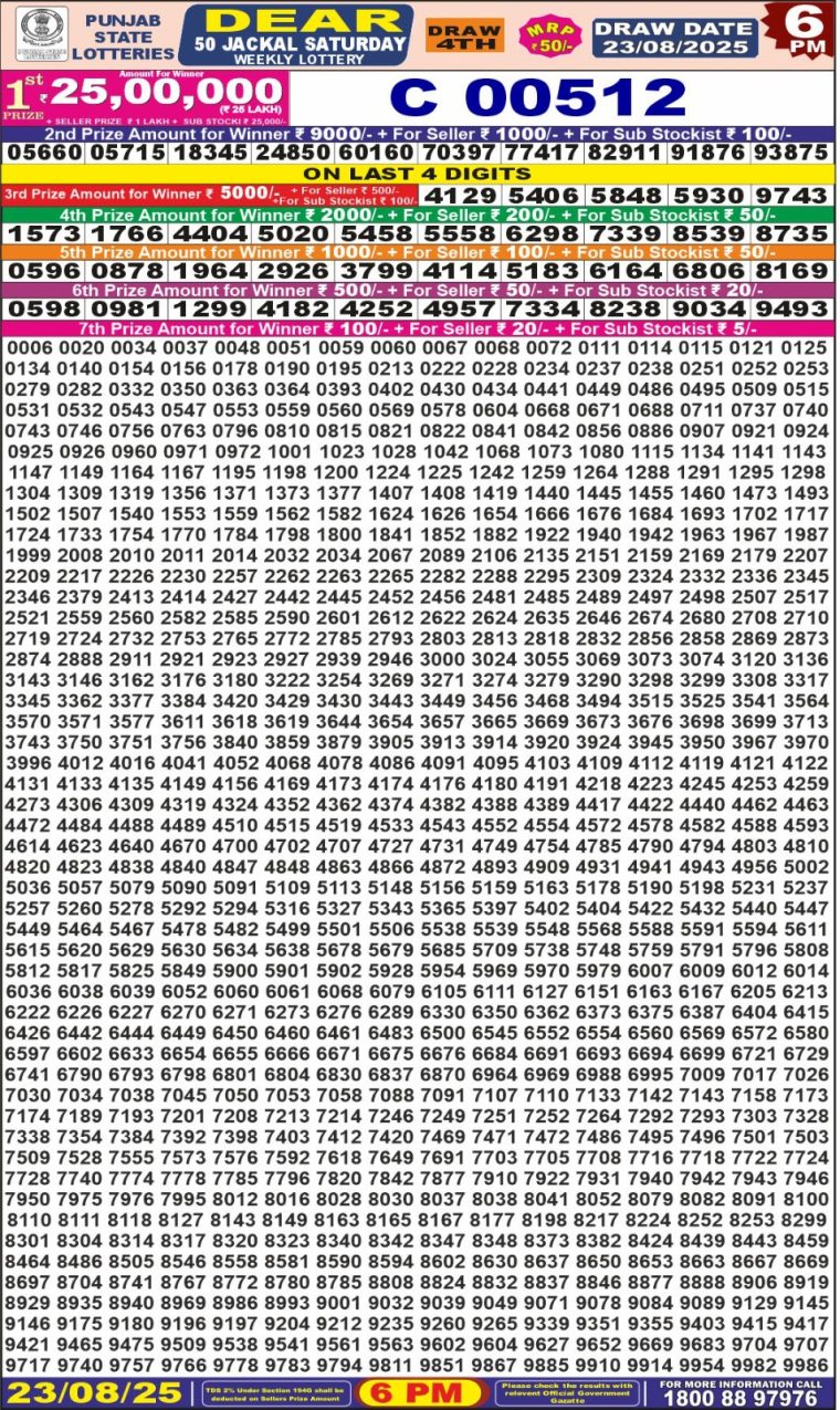 Punjab State Dear 50 Jackal Saturday Weekly Lottery Result 6pm 23-08-2025 Declared