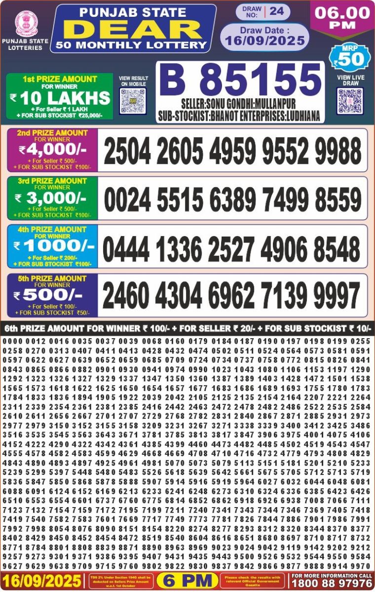September 16, 2025  Leave a Comment on Punjab State Dear 50 Monthly Lottery Result 16.09.2025